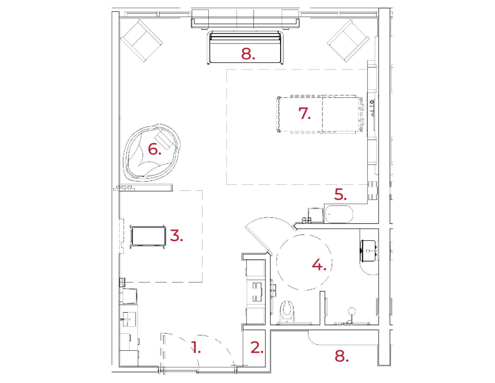 This birthing suite redefines the clinical experience by merging the warmth of nature with the ease of modern hospitality. Earthy tones, organic textures, and thoughtful lighting cultivate a peaceful, restorative atmosphere that prioritizes both medical functionality and emotional comfort. Designed for the full birthing journey, the space supports families with home-like touches, integrated storage, and room for connection.